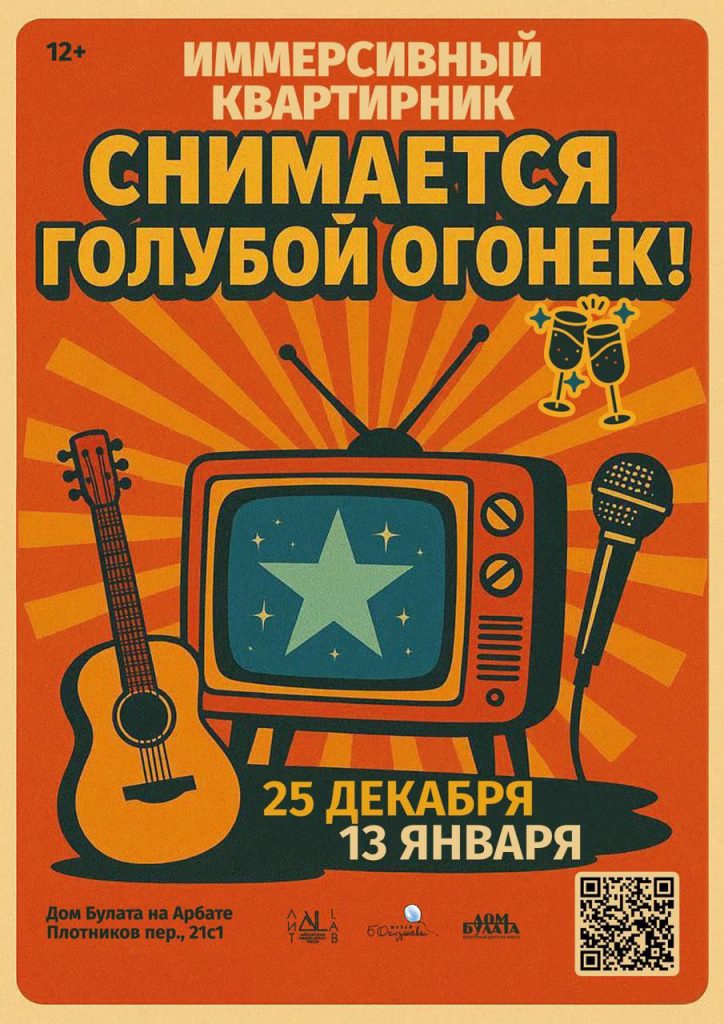 Вместе мы проживём вечер, когда собирается снег за окном, когда мечты становятся смелее, а сердца — мягче. Здесь любовь рождается на сцене, смех звучит от души, а знаменитые мелодии превращают Дом Булата в маленький телецентр, где всё возможно.