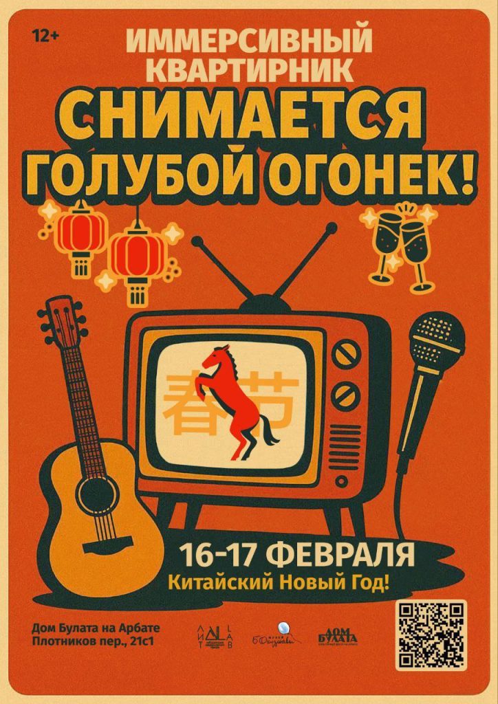 🍊 Вы попадёте в тёплую, домашнюю обстановку уникального пространства Дома Булата, и сразу окунётесь в атмосферу 80-ых! Музыка, бокал ледяного советского шампанского, мандарины — все это вас ждет еще до начала «Голубого огонька»